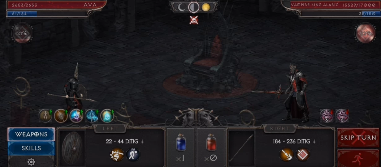 Первый комбо-ход кастуем 3 дебаффа с летучими мышами и 1 Etherial. Обычный ход пропускаем, чтобы с нас не слетел бафф. На втором ходу, если ваше HP близко к максимальному, атакуйте Короля-вампира.