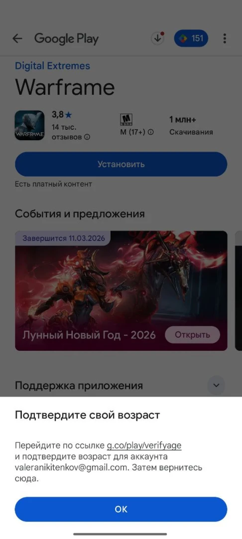 Всё равно удаляю и вижу кнопку «Установить». В надежде на то, что я смог обойти систему, нажимаю на эту кнопку и вижу надпись «Подтвердите ваш возраст». Прикрепляю ссылку и рекомендую сразу по ней пройти, если у вас такая же проблема, как и у меня, чтобы не закачивать лишний раз Warframe.