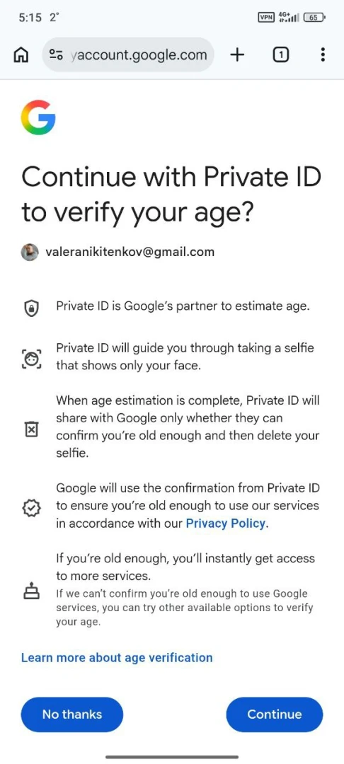 Во время проверки вашего возраста через селфи не нужно будет ворочать головой и принимать разные позы: посмотрите в объектив несколько секунд, после чего вас уведомят, что селфи удалено с серверов Google.