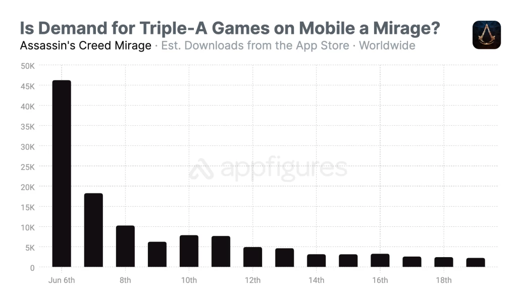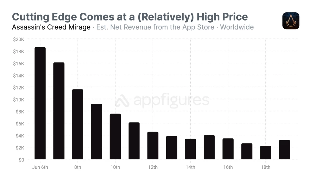 В итоге получается, что ежедневные скачивания и доходы AC Mirage на iOS мелкие по сравнению с F2P-проектами. Данные от Appfigures дают возможность провести параллели AC Mirage с Assassin's Creed Rebellion, выпущенной 21 ноября 2018 года эксклюзивно для смартфонов — за тот же промежуток времени Rebellion скачали 1.9 млн раз по сравнению с 123 000 скачиваниями Mirage. Доходы тоже очень разные — $981 000 у Rebellion, что на 612% больше, чем у Mirage.