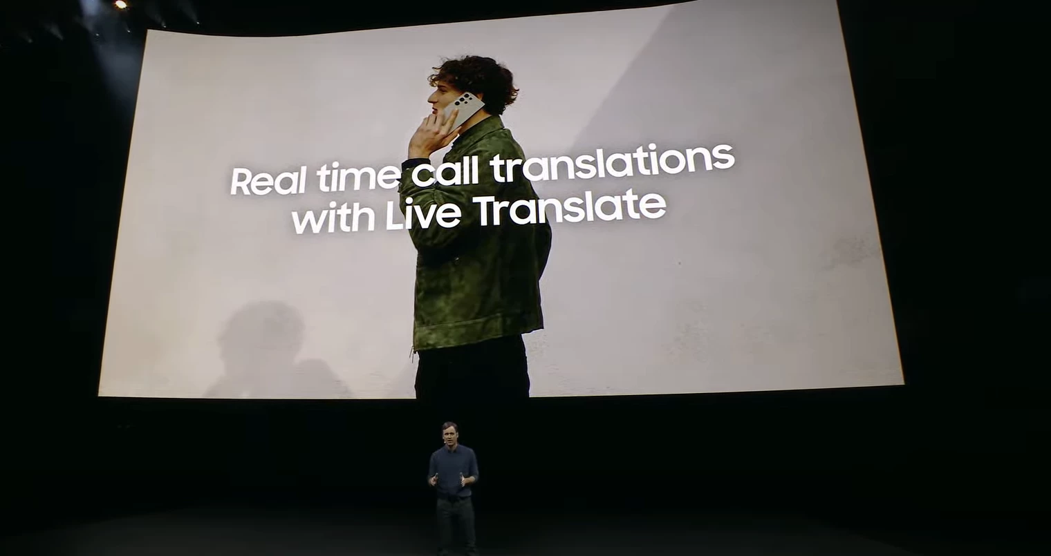 Презентация началась с обзора возможностей Galaxy AI. Первая из них — перевод звонков на другой язык в прямом эфире в виде текста. На выходе смартфоны будут поддерживать до 13 языков, среди них нет русского.