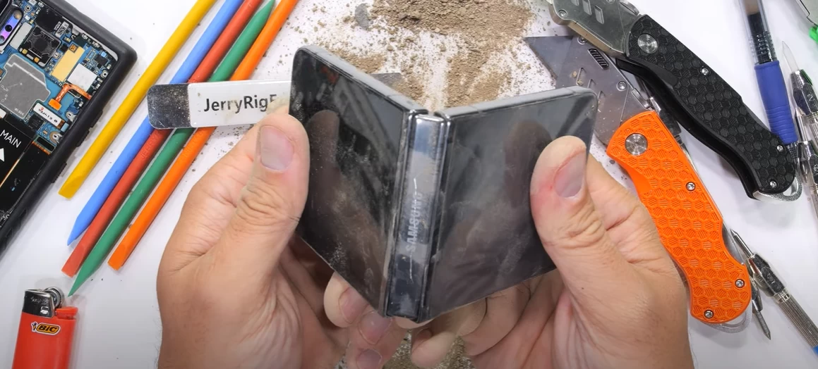 Samsung Z Flip5 поцарапали, посыпали песком и подожгли зажигалкой