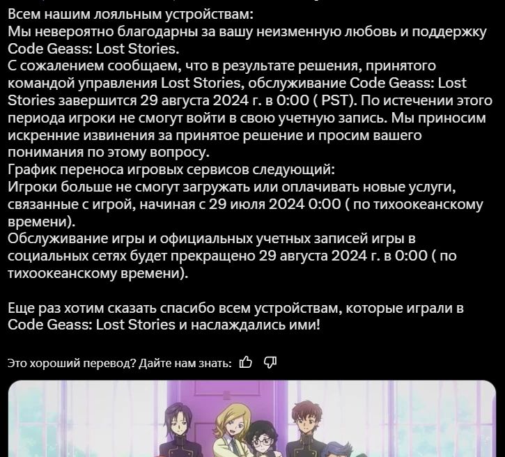В комментариях к посту разработчиков пишут, что Code Geass: Lost Stories закрывают до того, как она успела появиться в большем числе глобальных стран. Другие игроки советуют разработчикам перенести аккаунты с «глобалки» на японскую версию и добавить в неё поддержку английского языка.