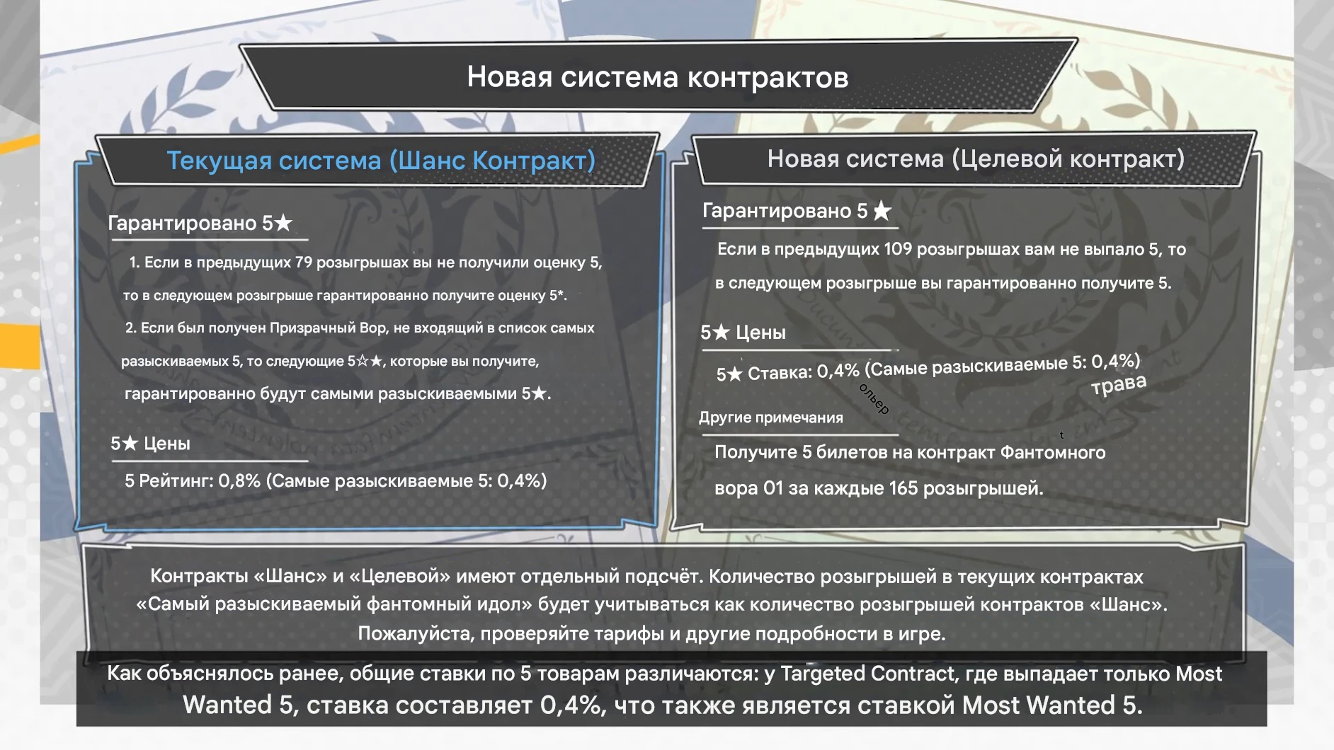 До 23 октября в Persona 5X была одна гача-система, и действовала она так — если вы не получили 5-звёздочного персонажа за 79 круток, на 80-ю крутку вам обязательно выпадет 5-звёздочный герой. Если это был не «самый разыскиваемый» вор, то в следующий раз это точно будет баннерный вор. Шанс выпадения следующий — 0,8% для большинства 5-звёздочных героев и 0,4% для баннерных героев.