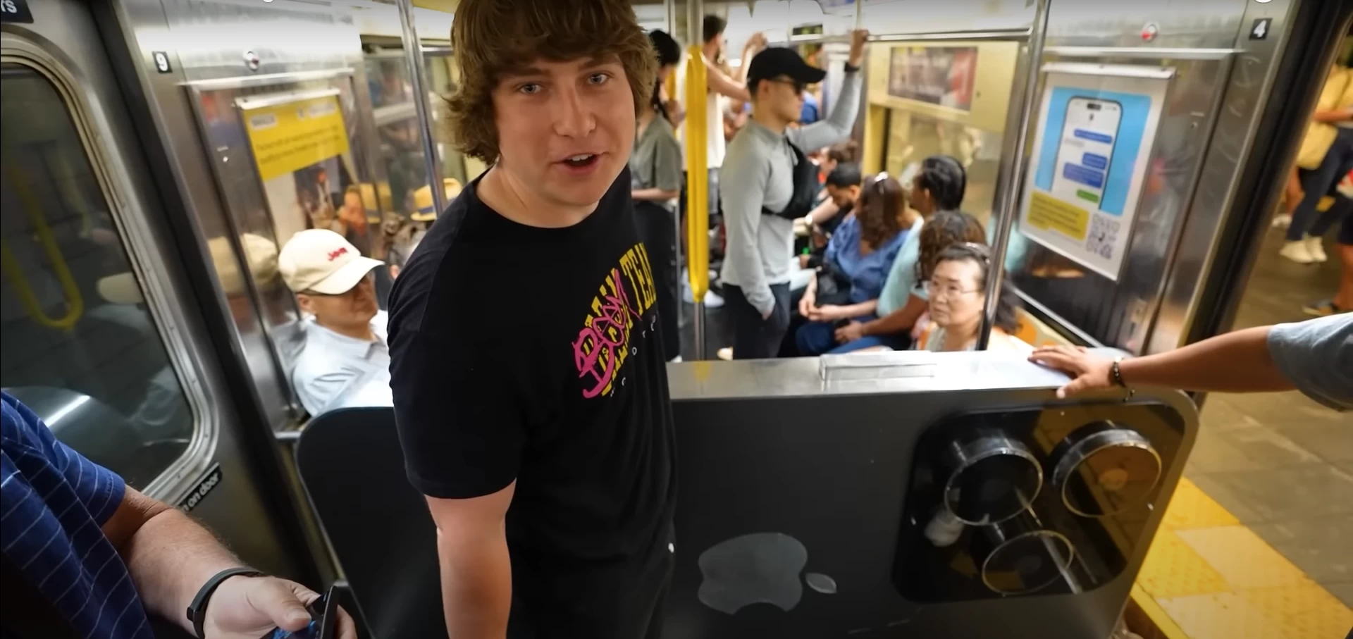 Ютубер создал 2-метровый Айфон, играл на нём и катался в метро