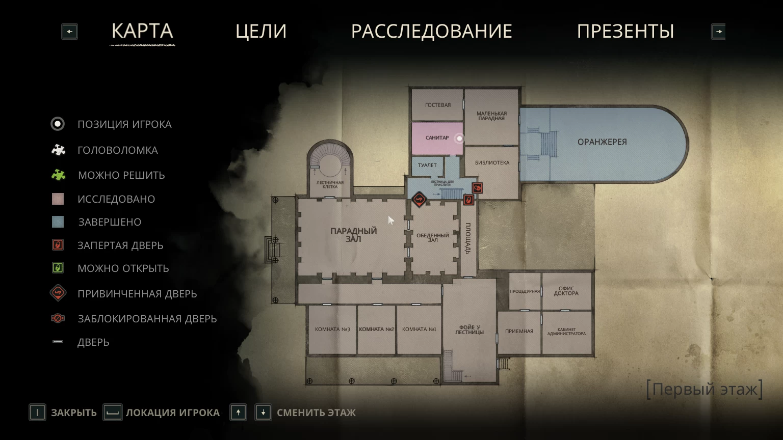 Ещё игроку выдают карту особняка, по которой можно отслеживать, где есть головоломки, где двери закрыты и куда вообще идти. Локации выстроены так, что в целом ты понимаешь, где находишься, но порой легко запутаться и приходится ориентироваться по карте, так как никаких указателей и компасов нет.
