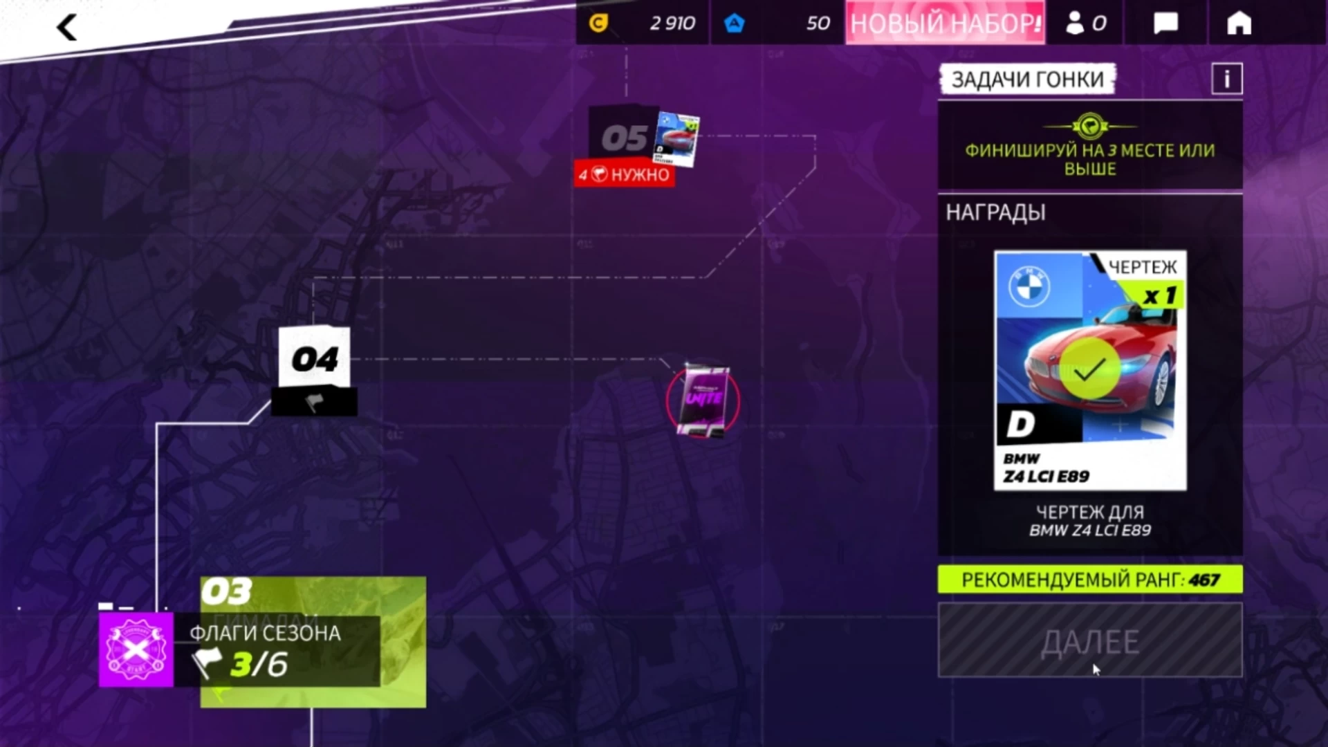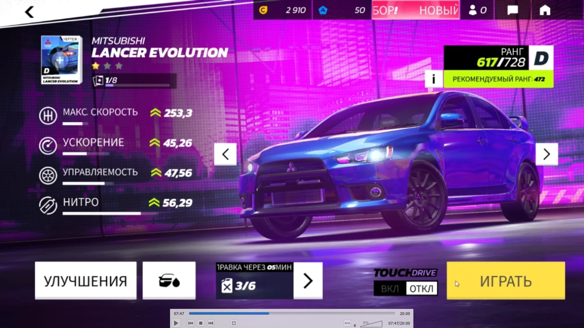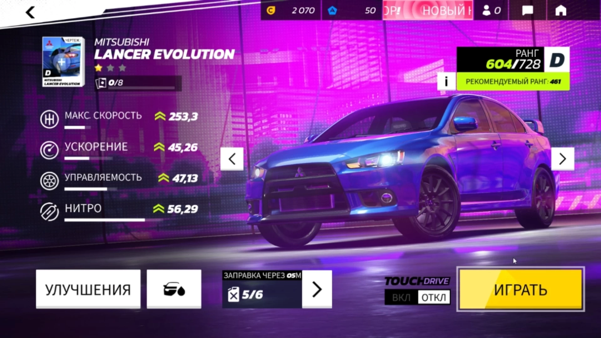 Перед гонкой вам дают выбрать, на какой машине вы поедете. Главное, чтобы тачка соответствовала рекомендуемому рангу. По мере прокачки вы будете повышать ранг машины.