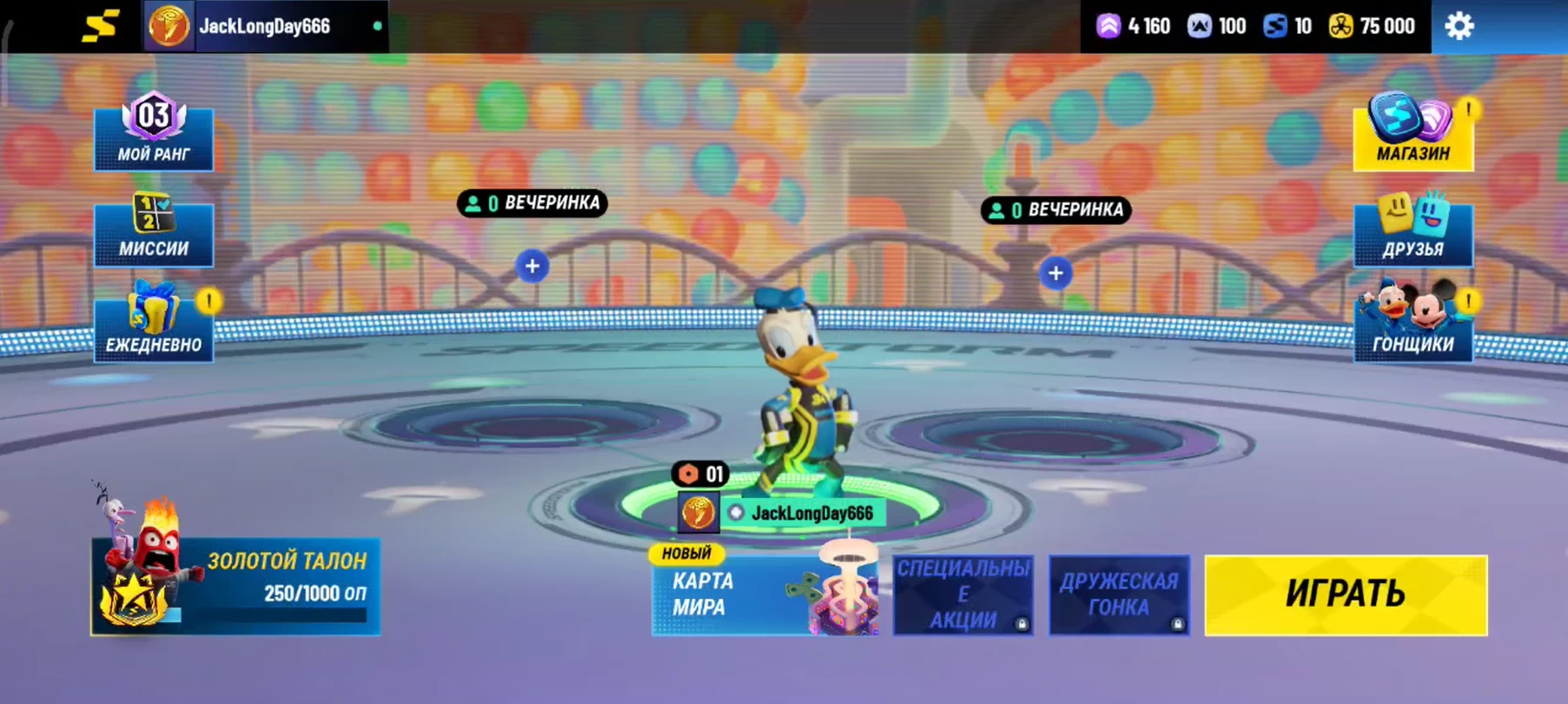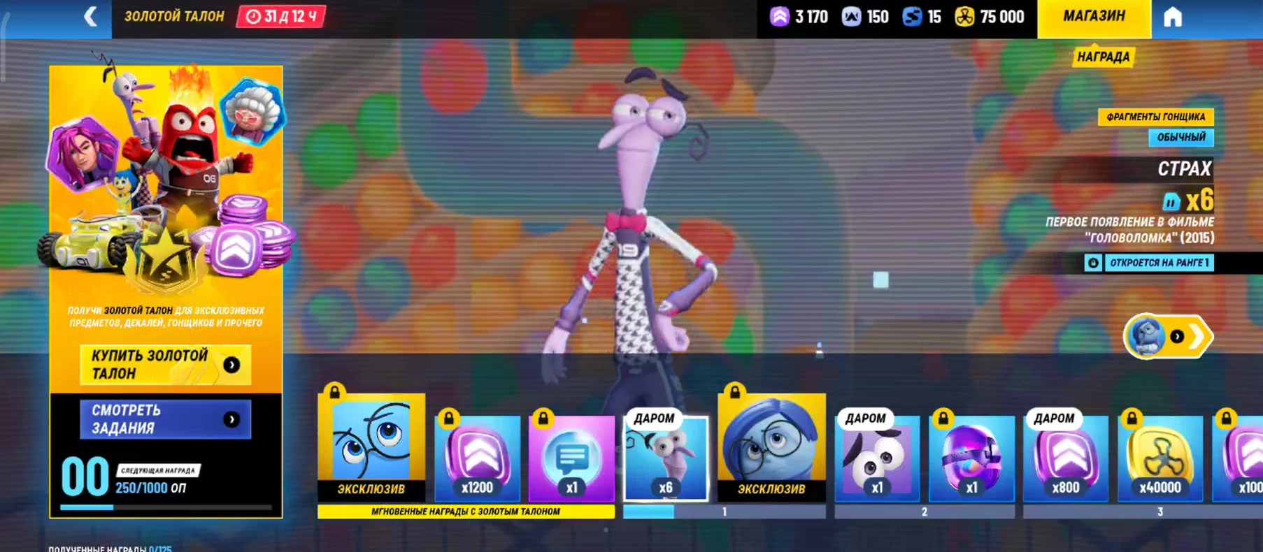 По центру экрана есть 2 слота для ваших друзей, чтобы играть втроём. Снизу слева расположен «Золотой талон» — сезонный пропуск, который на старте связан с выходом мультфильма «Головоломка 2».