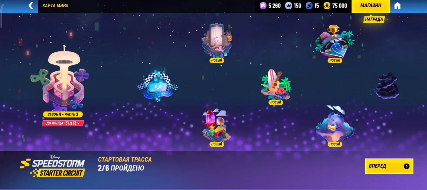 Сверху слева можно перейти в свой профиль и посмотреть общее пройденное расстояние в километрах, вашего любимого гонщика, ранг и так далее. Помимо этого можно посмотреть ежедневные миссии и собрать ежедневные награды за вход.