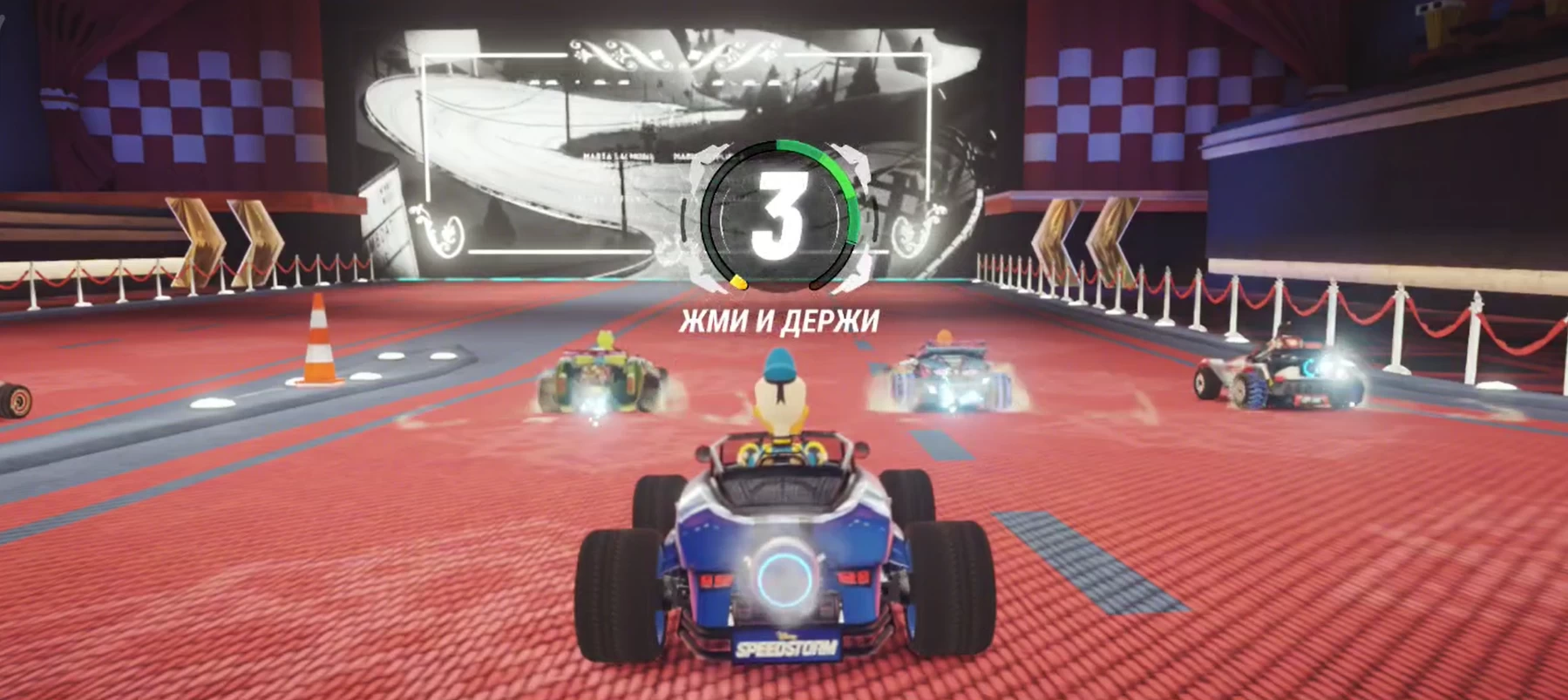 По сути гонки в стиле Mario Kart — основа и почти весь игровой процесс, который есть в Disney Speedstorm. Помимо PvE-заездов есть и PvP-матчи, за победы в которых повышается ранг. На старте мы ждём остальных игроков, а после должны стартовать «с газком» — для этого нужно тапнуть по центру экрану и сделать так, чтобы под конец отсчёта «3, 2, 1» индикатор вашего спидометра находился в зелёной зоне. Это даст фору на старте, так что если ваш гонщик стартует с задних позиций, то он сможет спокойно вырваться вперёд.
