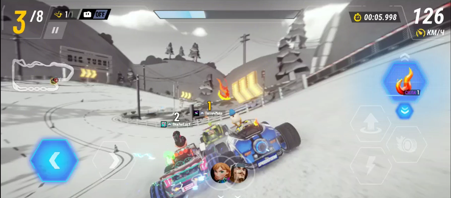 Всего в матчах участвуют 8 гонщиков, причём в первых гонках с вами будут сражаться боты — они часто притормаживают на финише, делая это очень деликатно, чтобы игрок не обиделся и подумал: «Ну ладно, наверное это был реальный соперник, просто он прямо перед финишной чертой отвлёкся». Кстати, ваш пинг не показывают, поэтому создаётся впечатление, что сервера находятся где-то рядом, но это не так — Disney Speedstorm официально нельзя скачать из российских App Store и Google Play, потому что Gameloft пытаются максимально откреститься от РФ.