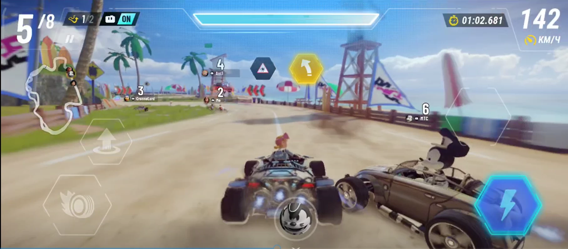 Авто-управление в Disney Speedstorm настолько безобразное, что включать его не стоит даже в том случае, если вас отвлекают, вам надо отойти или вы считаете себя казуальным геймером. Дело в том, что вам нужно очень быстро принимать решение, по какому именно пути ехать: проехать по «траве» с замедлением скорости или по дороге-зигзагу, проехаться по полосам ускорения или подобрать активную ловушку. Также резко меняется управление: дрифт и прыжок резко оказываются слева, а ускорение и активный навык — справа.