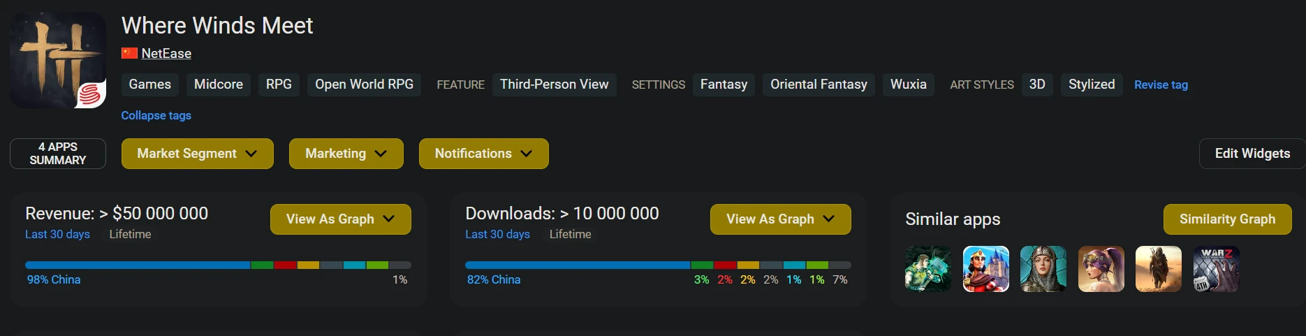 По статистике сайта AppMagic, Where Winds Meet заработала $50 млн, учитывая Китай — эта страна отвечает за 98% от всей суммы. На втором месте стоит США — менее $500 000. В целом, у проекта нет какого-то одного региона, где бы его полюбили больше; в топ по донатам также вошли: