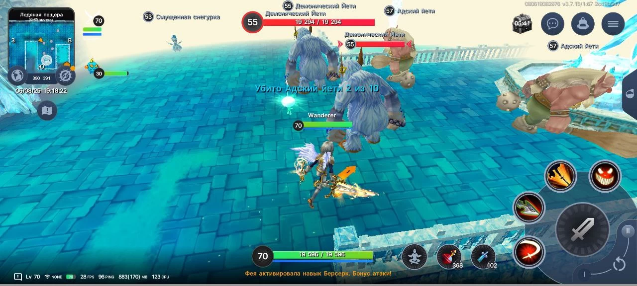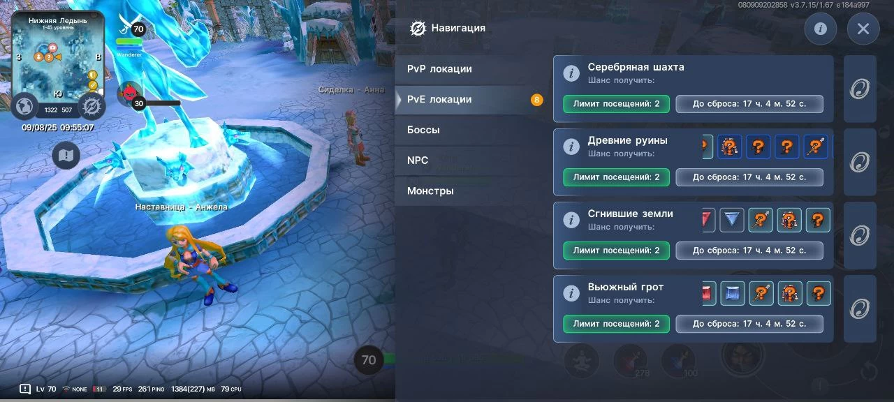- Ледяная пещера для персонажей 65+ уровня — холодный грот, покрытый инеем. Это территория гильдий: команды сражаются за сундуки, мини-боссов и главного босса в центре. Каждая гильдия-участник начинает свой путь из одной точке (каждый раз в новой), и тут важна тактика. Победа часто достаётся тем, кто умеет думать нестандартно.