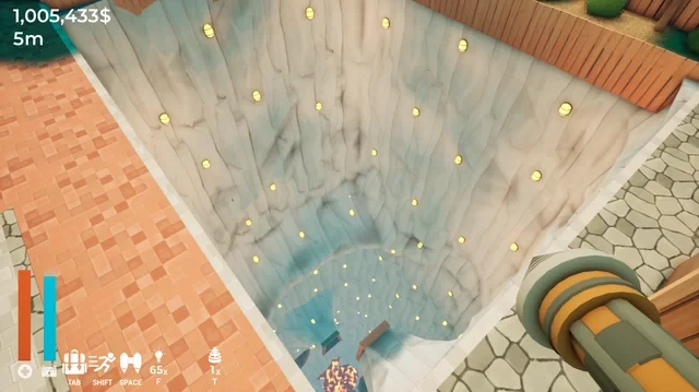 По мере прокачки своей лопаты в какой-то момент вы получите бур — более быстрое и удобное средство по избавлению от земли. С ним я даже решил зачистить весь садовый участок вместо того, чтобы копать только вглубь. В отличие от Minecraft, вам не нужно крафтить особую экипировку из полученной руды — просто продавайте её и радуйтесь жизни. Сначала за один заход вы будете получать максимум $5-10, но со временем эта сумма увеличится до $1800 и даже больше.