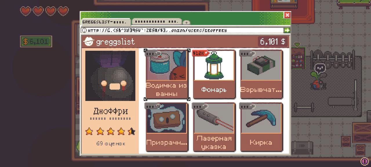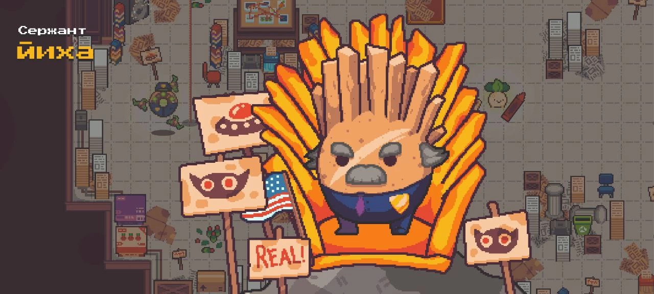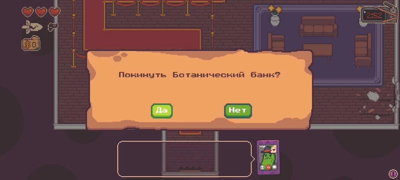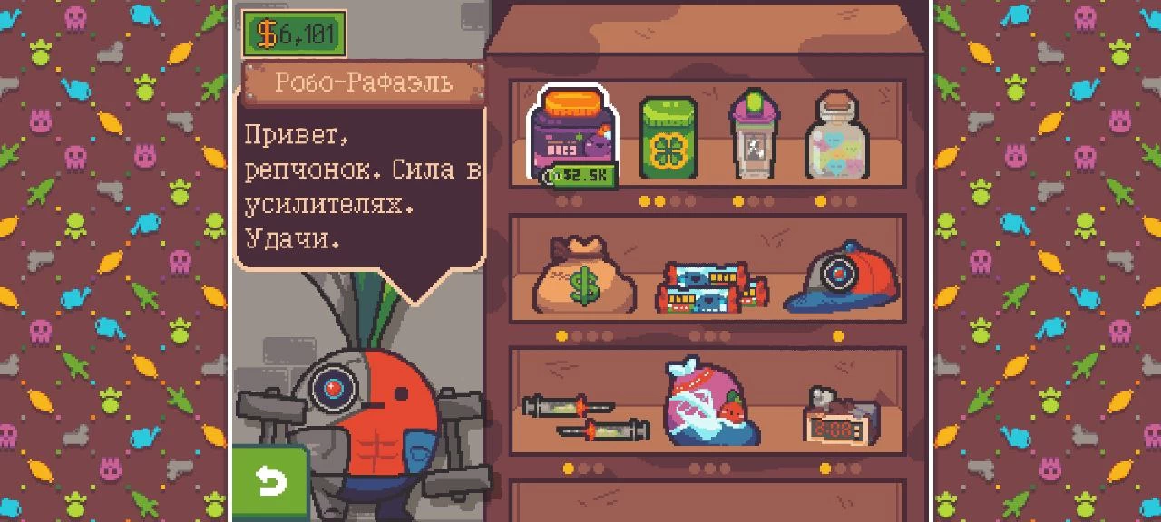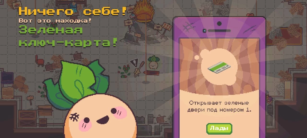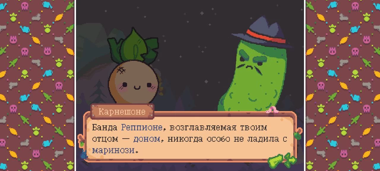 Первое, чем цепляет Turnip Boy Robs a Bank это своей премиальностью. За 449 рублей я получил русскую локализацию (озвученных диалогов нет), поддержку полноформатного режима с рамками по бокам (прощай, чёрные полосы) и поддержку контроллера.