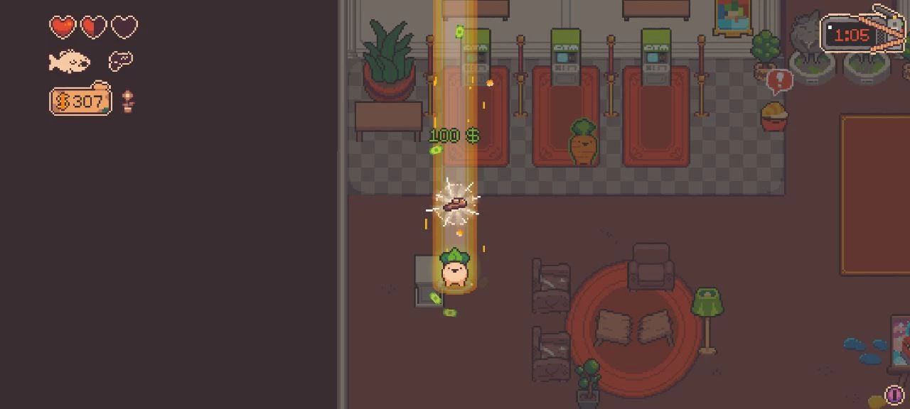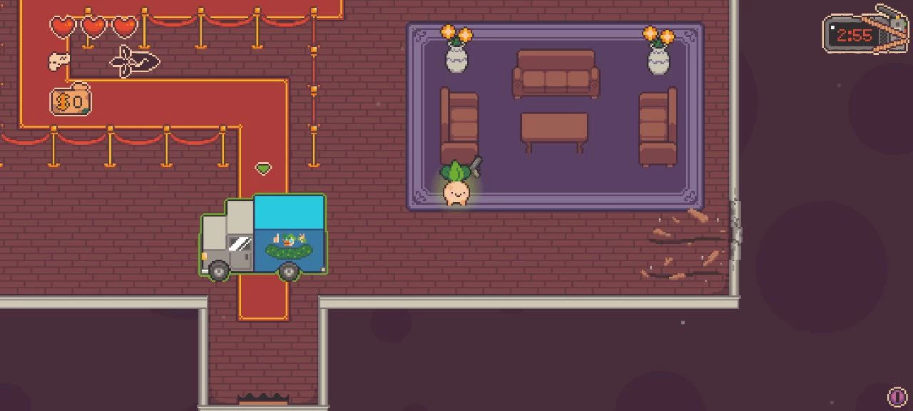 Turnip Boy Robs a Bank это «рогалик на чиле», поэтому усиления, которые вы покупаете на базе — постоянные. Какие-то повышают урон в ближнем бою или скорострельность, вторые увеличивают HP и вместимость сумки с деньгами, а третьи — добавляют заветные минуты к забегу (копы приедут позже) и увеличивают шанс выбить из врагов более крутую пушку.